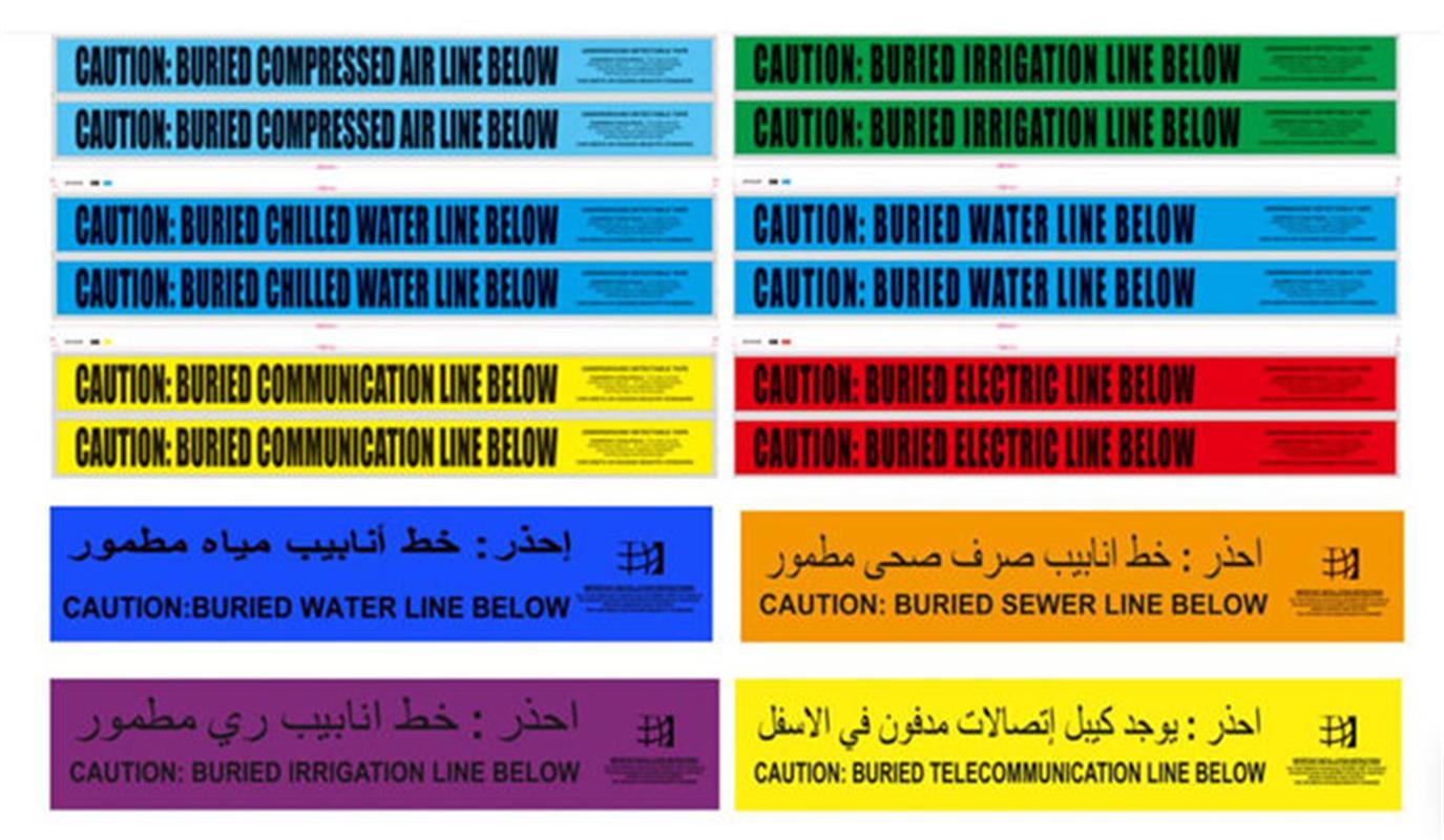डिटेक्टेबल अंडरग्राउंड वार्निंग टेप एक विशेष रूप से लेमिनेटेड पीईटी/फॉइल/पॉली मिश्रण है।यह अद्भुत मिश्रण (पॉलीस्टर के साथ) अन्य सभी polyethylene प्रकार का पता लगाने योग्य चेतावनी टेप की तुलना में असाधारण ताकत विशेषताओं प्रदान करता हैइसके एपीडब्ल्यूए रंग कोडित पृष्ठभूमि पर बोल्ड ब्लैक संदेश को इस तरह से इलाज किया जाता है ताकि क्षार, एसिड और या किसी अन्य विनाशकारी तत्वों के संपर्क में आने पर यह खराब या फीका न हो।